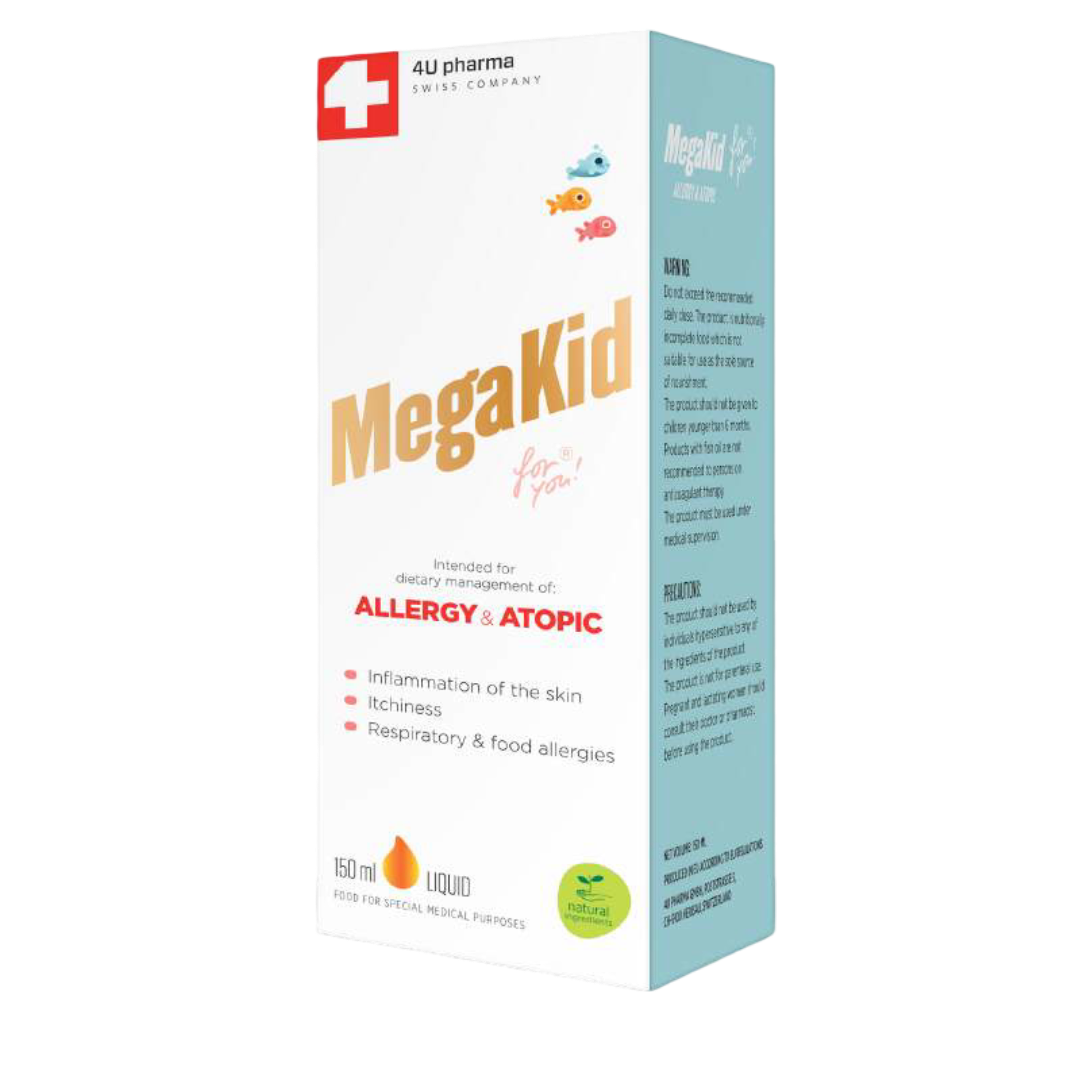 Formulacija MegaKid Allergy & Atopic for you! namenjena je za primenu kod alergija i atopijskog dermatitisa, stanja koja se manifestuju svrabom i upalom kože. Može se koristiti kod odojčadi od 6 meseci nakon rođenja. Sadrži riblje ulje kao izvor EPA i DHA omega-3 masnih kiselina, ulje iz semenki crne ribizle kao izvor gama-linolenske kiseline (GLA) i vitamin D3. U 2,5 ml sirupa nalazi se doza od 1g omega-3 (EPA + DHA).