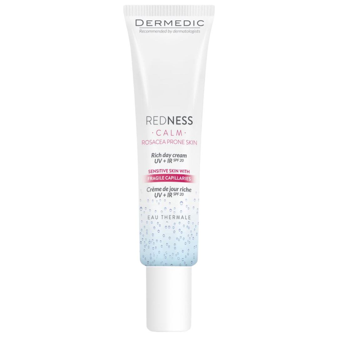 REDNESS bogata dnevna krema UV+IR SPF20 štiti kožu od pregrevanja usled izlaganja sunčevoj svetlosti i drugim izvorima zračenja. jača osetljivu kožu zahvaćenu kuperozom i štiti je od faktora koji izazivaju nastanak i konsolidaciju crvenila.