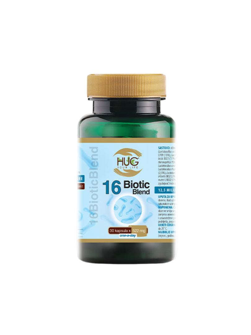 16 BioticBlend sastoji se od 16 bakterijskih sojeva sa sposobnošću razmnožavanja koji su prirodno prisutni u ljudskim crijevima. Sadrži najmanje 12,5 milijardi mikroinkapsuliranih bakterijskih kultura. Kao izvor hrane za zdrave bakterije u proizvodu se nalazi inulin koji ima pozitivan učinak i stimulativno djelovanje na crijevnu mikrobiotu.