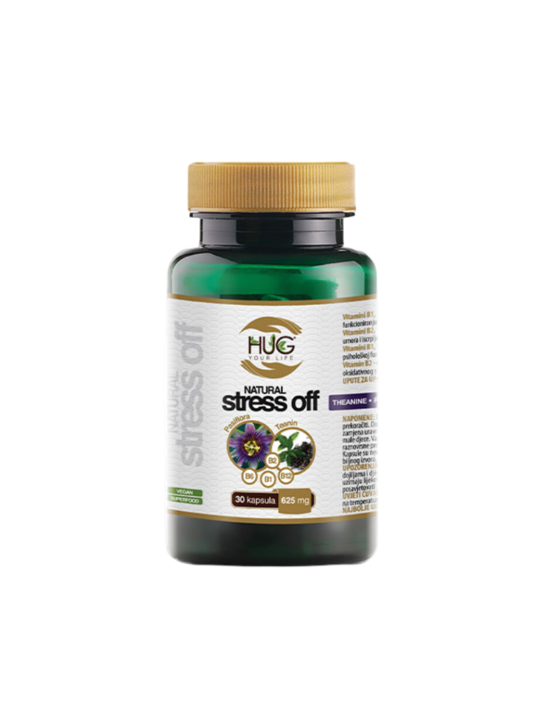 HUG Natural Stress off sadrži teanin i standardizirani ekstrakt biljke pasiflore, poznate po svojoj dugoj tradiciji korištenja. Proizvod donosi čak 30 odobrenih zdravstvenih tvrdnji. Čisti sastojci i precizna formulacija obogaćena vitaminima B skupinečine ga pouzdanim izborom za svakodnevnu rutinu, osobito u razdobljima pojačanog stresa i psihičkog napora.